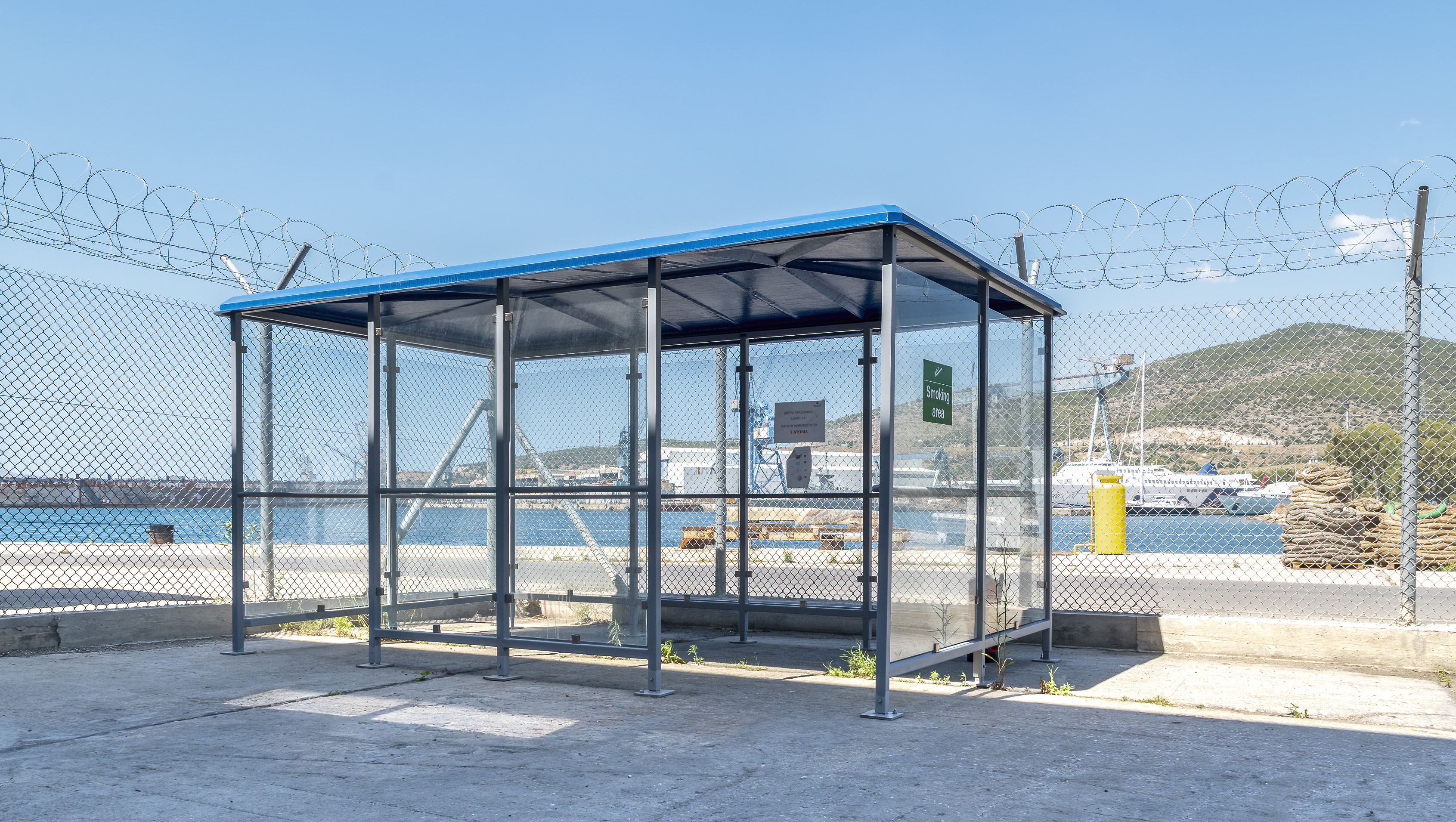 Με σκελετό από γαλβανισμένο εν θερμώ χάλυβα, περιμετρική κάλυψη με υαλοπίνακες τρίπλεξ και οροφή από ενισχυμένο οικολογικό πολυεστέρα.