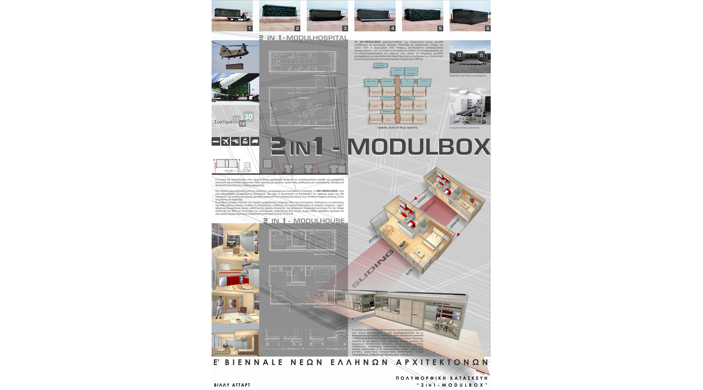 Το 2IN1-MODULHOUSE, μέρος της ευρύτερης σειράς 2IN1-MODULBOX, είναι μια πολυμορφική μεταφερόμενη κατοικία, η οποία διπλασιάζει δια «κύλισης» τον ωφέλιμο χώρο της, σε θέση πλήρους έκτασης. Επιπλέον, διαθέτει την υποδομή για απόλυτη ενεργειακή αυτονομία. Η πλήρης ανάπτυξη και θέση σε λειτουργία της κατοικίας, διαρκεί λίγα μόνο λεπτά και απαιτούνται δύο άτομα, χωρίς πρόσθετα ειδικά εργαλεία και εξωτερική παροχή ισχύος.