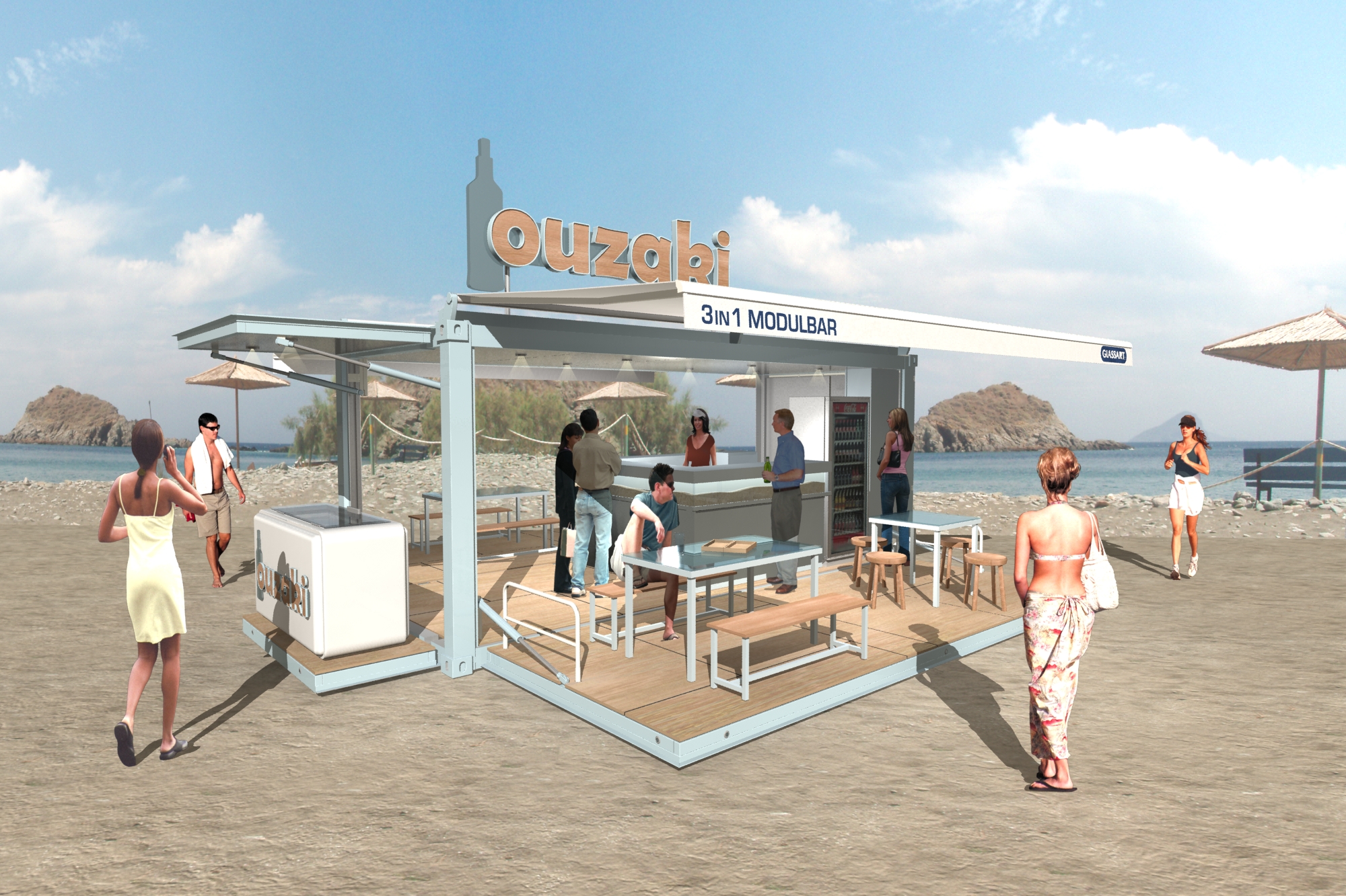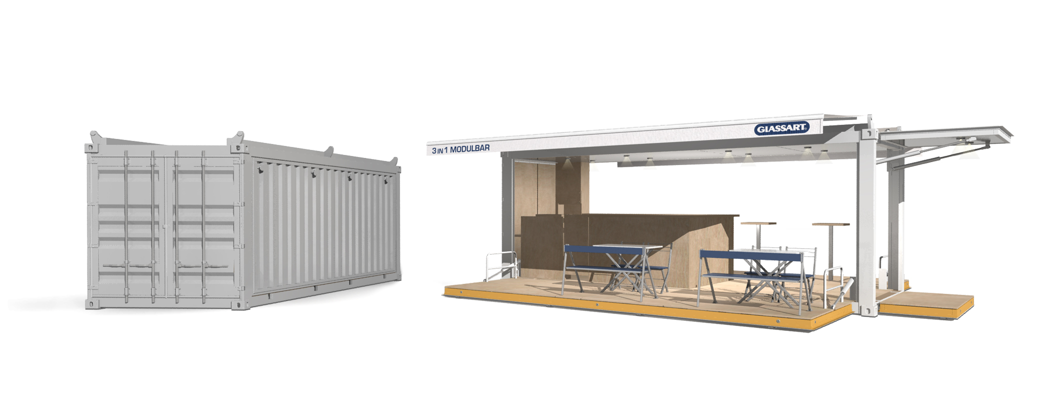 Η GLASSART καινοτομεί και πάλι στις ευέλικτες πολυμορφικές κατασκευές, με το 3IN1-MODULBAR. Πολυμορφική μεταφερόμενη κατασκευή, που τριπλασιάζει τον ωφέλιμο χώρο της, με αναδίπλωση των τοιχωμάτων, σε λιγότερο από 2 λεπτά, με το πάτημα ενός κουμπιού. Κλείνει ερμητικά και με ασφάλεια, όταν δε βρίσκεται σε φάση λειτουργίας. Το 3IN1-MODULBAR παραδίδεται, με ή χωρίς εξοπλισμό, σύμφωνα με τις απαιτήσεις του πελάτη. Μεταφέρεται εύκολα και οπουδήποτε.